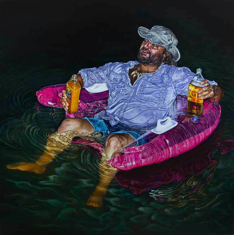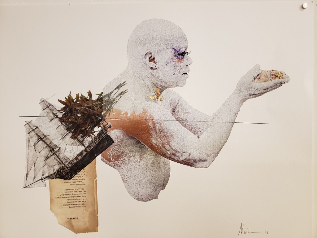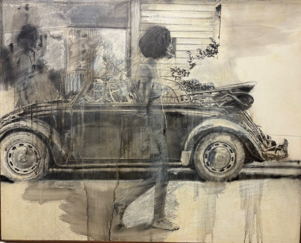On the other side of the gallery is a life-sized black and white figure painting, stretched horizontally, her body twisting through water by Morgan East of North Charleston. It is gorgeous and full of gesture, but look again and that body is visually, not literally, cut into many pieces.