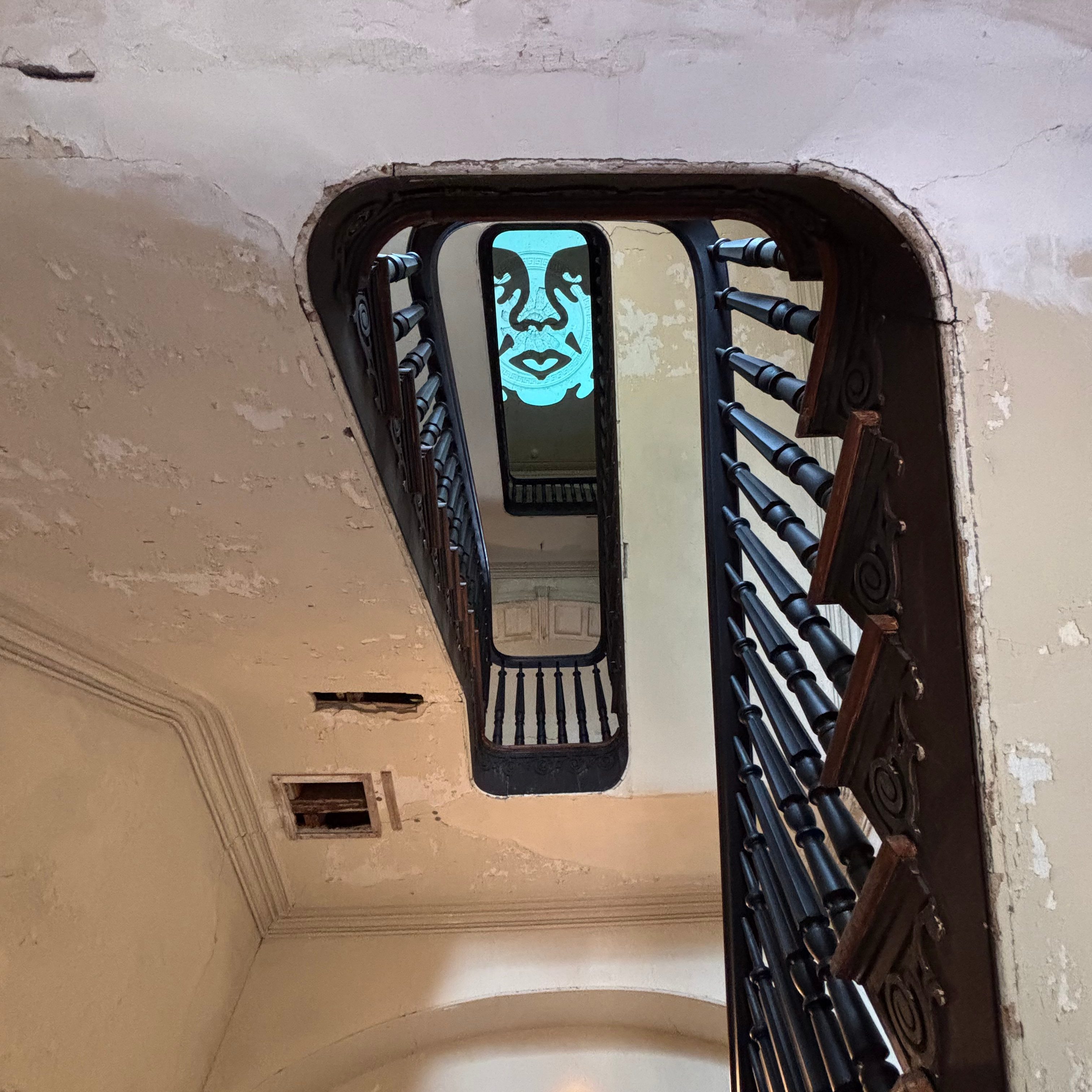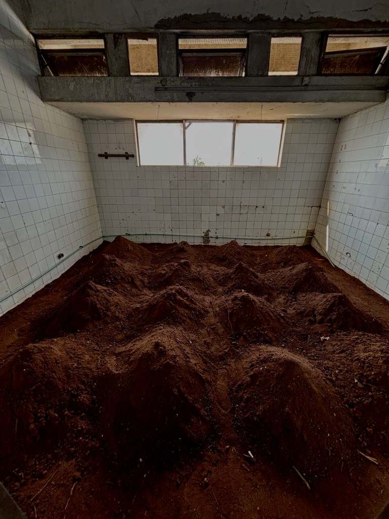 The last stop of the trip was at a decrepit, long abandoned high rise waterfront hotel which was most likely remarkable in its heyday of the late ’70s oil boom. The hotel is now home of NaHous for art installations and some shops. One of the main exhibitions there address the kind of poor quality processed food created by giant conglomerates many Nigerians consume. Another, nearly hidden away consisted of mounts of direct below a window where you can view the band and wind blown palms trees.