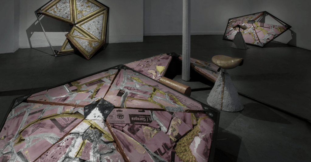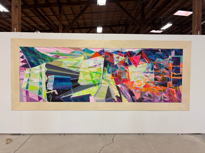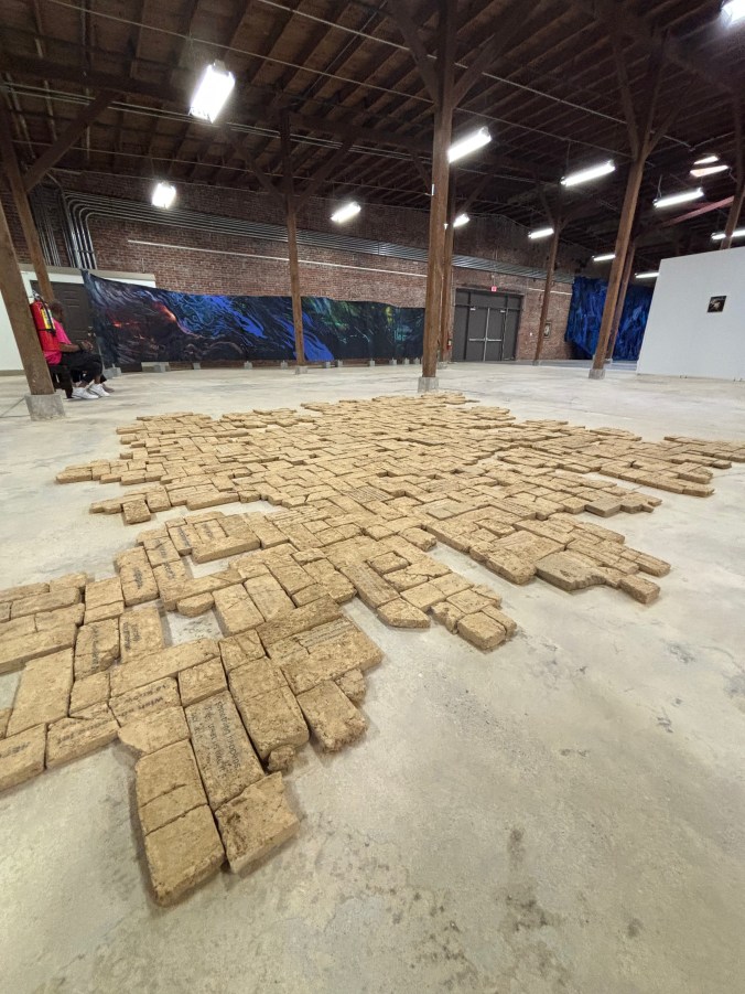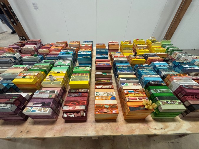 Ran down to Minnesota Street Project and environs where I was pretty much blown out of my shoes by the Damian Ortega papier-mâché sculptures that blend famous buildings with animals at Adrian Rosenfeld Gallery. Feel like I’ve seen four or five shows by Serge Attukwei Clotty at Ever Gold Projects, but I’m never less than thrilled by the constructions made of cut up plastic water jugs (mostly yellow.) And the Donna Ruff burned books, papers Jack Fischer gallery