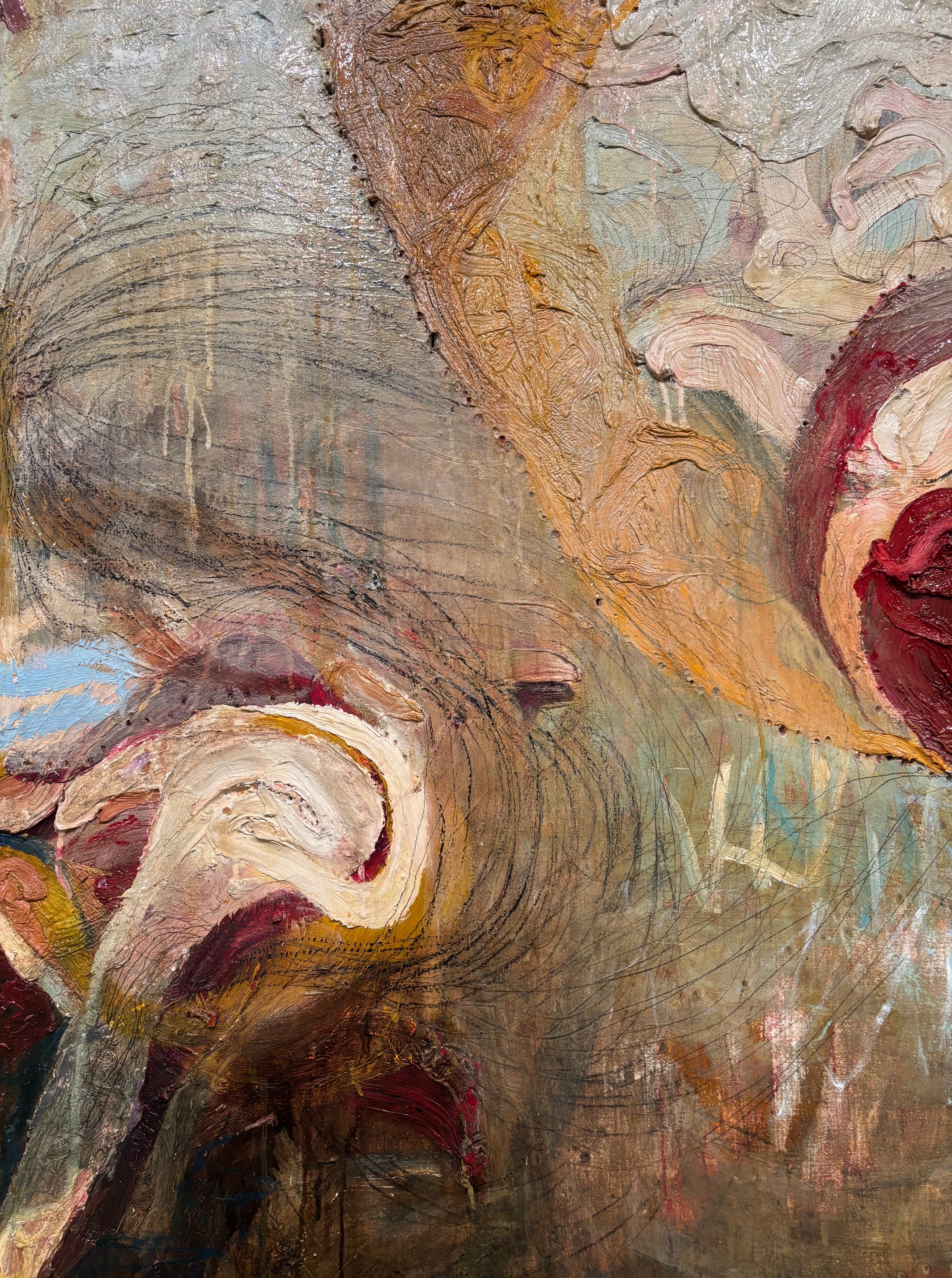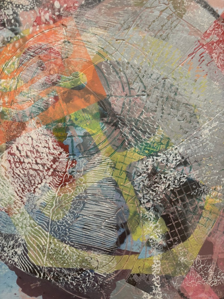 Works by Donald Medley of Rock Hill speak softly and powerfully. He uses a variety of methods, including printmaking, which give the surface a unique look, as doe his muted palette. There are many layers in his work, with geometric shapes shifting in an out of the space, sketchy small figures hanging out in the middle distance, and detailed faces up close.