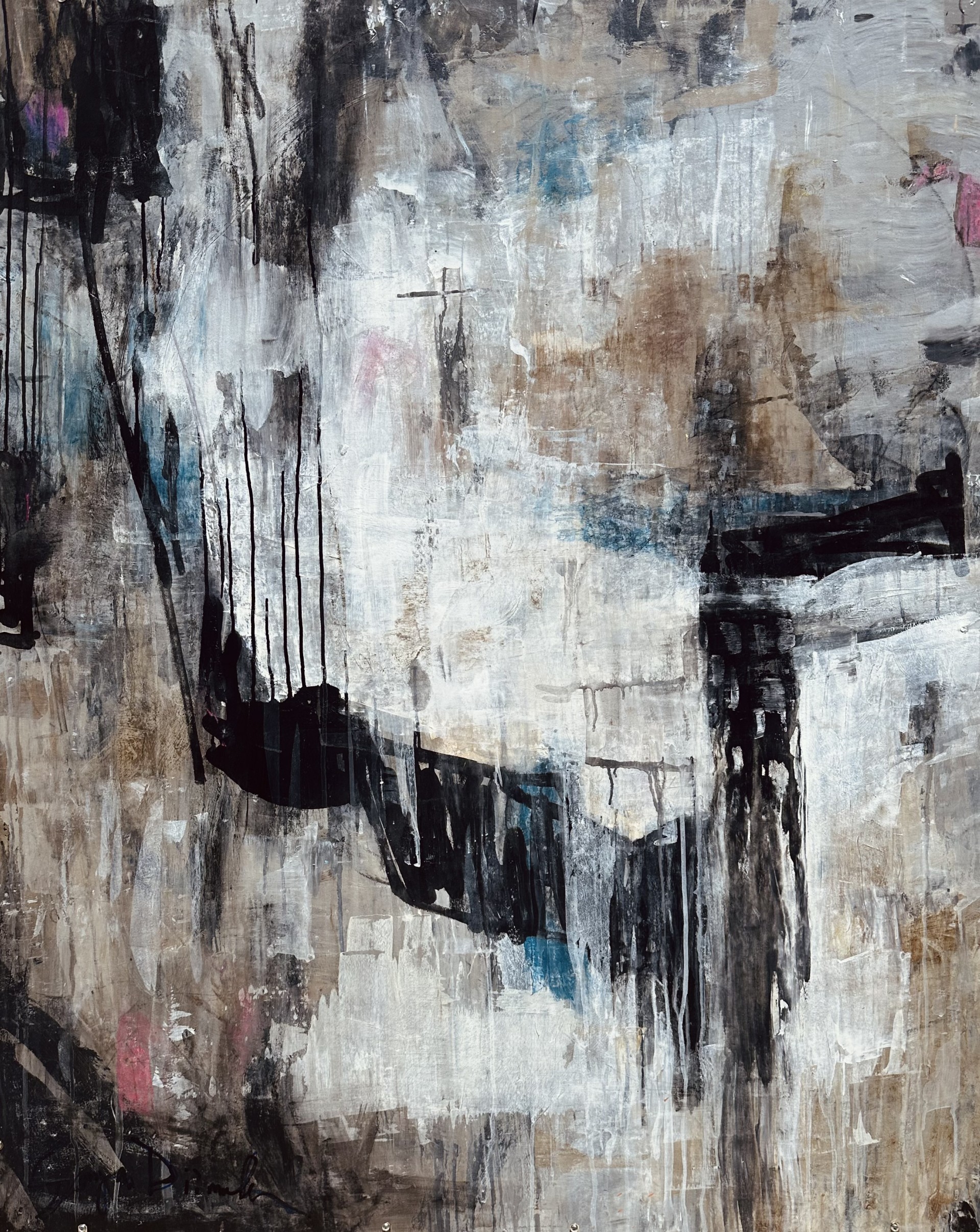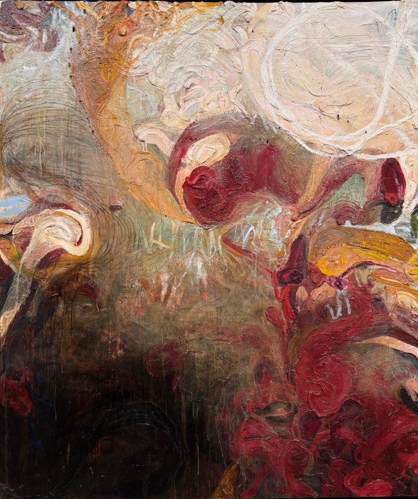 A large painting by Sonya Diimmler of Prosperity provides a bold hello to the show. It’s a bright orange-red explosion surrounded by slashes and swirls of blue, with open areas of white, and lots of drawing over the shiny surface. Nearby is Diimmler’s very dark and mysterious painting completely opposite of the welcoming painting in every way but even better.