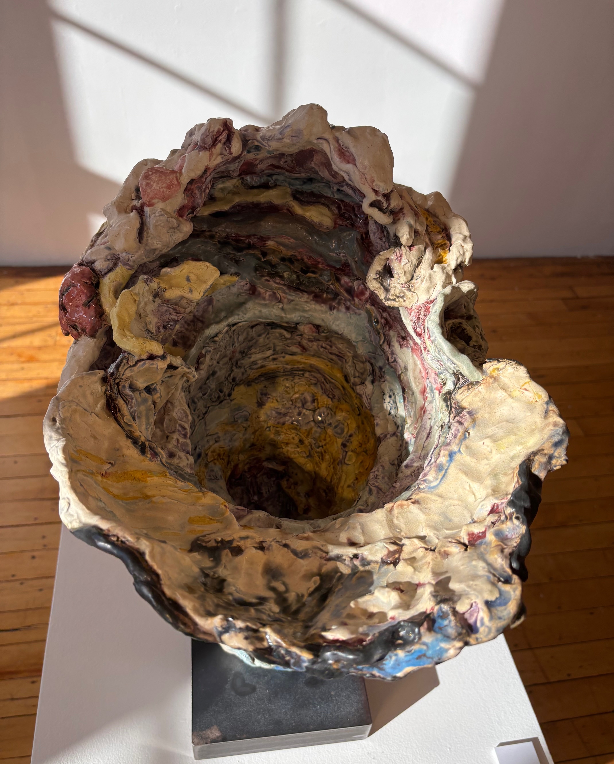 The three clay pieces by Jay Owens of Travelers Rest are hand built multi-color works both fun and threatening; buildings fight with one another and an undulating earth, a skeleton rides in the bed of an open pink hearse, and a clunky tornado whirls through the gallery.