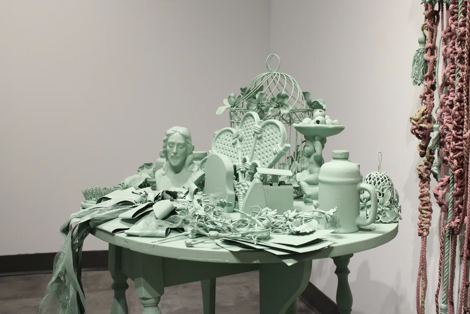 Filling the large gallery are the artist’s takes on a vanity table, a kitchen, a clothes line, and the most disastrous wedding cake ever, with titles You’re Still Pretty on the Inside, Don’t Count Your Chickens Before They Hatch and I Can feel the Holy Spirit Here, the last incorporatinga QVC style video selling a cross made of seashells and other items. Many of the objects in each installation are painted monochromatic or made of a dull brown paper pulp creating an overwhelming, but unvaried and dull-colored world.